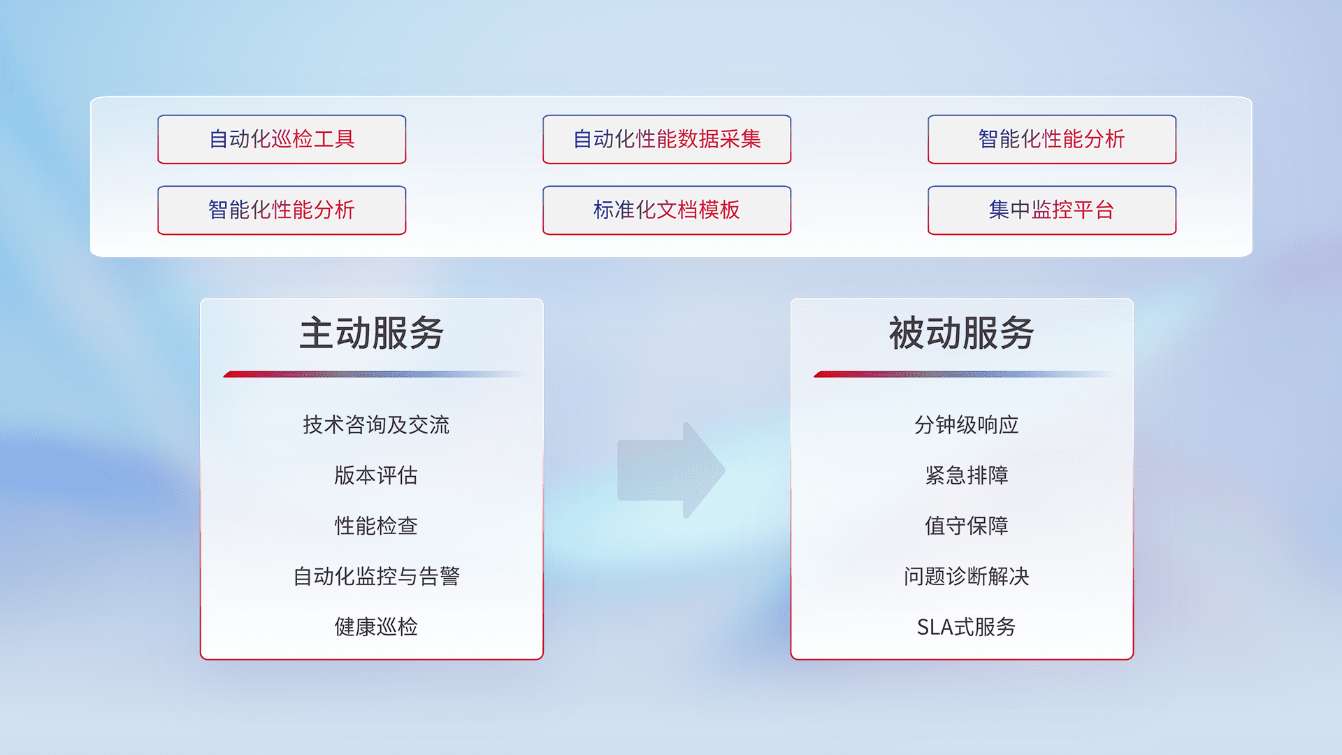 智能化工具和标准化文档,,,保障服务质量,,提供主动服务(包含技术咨询、、、版本评估、、性能检查、、、、自动化监控与告警、、健康巡检)和被动服务包含(分钟级响应、、紧急排障、、、值守保障、、问题诊断解决、、SLA服务)。。。
